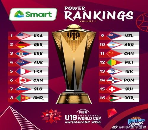 男篮U19世界杯首期实力榜:中国队第11美国队&德国队前二