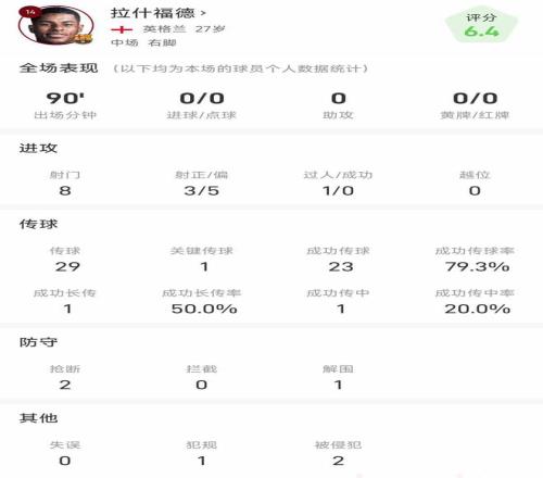拉什福德数据:8次射门未能进球,29次传球23次准确