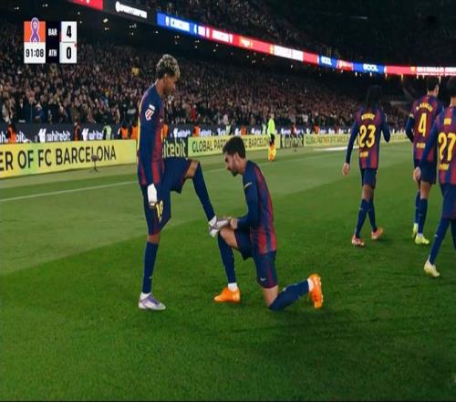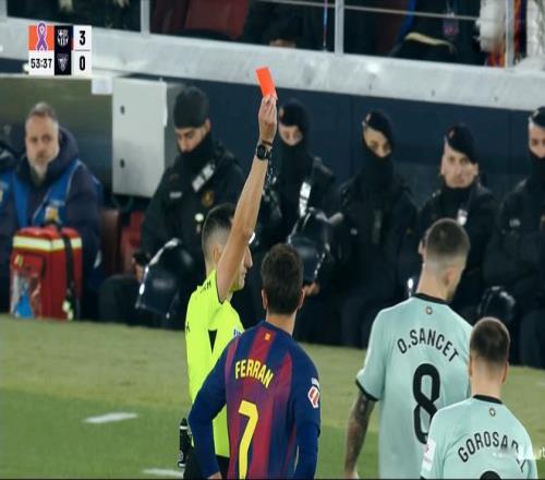 下半场回来,巴塞罗那抢开局的意图非常明显,保持前场高压的逼抢。埃里克加西亚抢断、直塞,费尔明拿球劲射破门,3:0!再度丢球后,毕尔巴鄂竞技球员的心态出现了失衡,桑切特暴力铲倒费尔明,险些引发冲突,裁判经过视频回放之后,直接出示红牌将其罚下!大比分落后,场面又少一人,毕尔巴鄂竞技基本追分无望了。 为了几天后的欧冠联赛,弗里克不断换下主力球员,德罗、贝尔纳尔等小将先后登场。第80分钟,毕尔巴鄂竞技利用定位球的机会,险些洞穿巴萨的球门,幸亏霍安加西亚的奋力扑救。随后,伤愈归来的拉菲尼亚登场,引发全场球迷的起立鼓掌。最后时刻,亚马尔中场连过数人,送出一脚手术刀直塞,费兰托雷斯单刀破门,4:0!