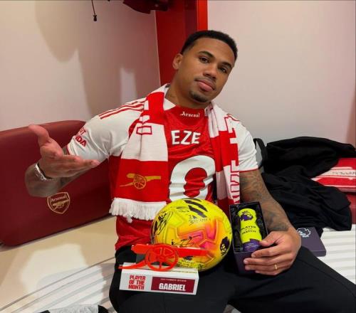 英超第12轮北伦敦德比,阿森纳主场4-1大胜热刺,因伤缺阵的枪手后卫加布里埃尔赛后晒出他反穿埃泽球衣手拿全场最佳球员奖杯的照片,并标记了热刺的巴西前锋里沙利松。