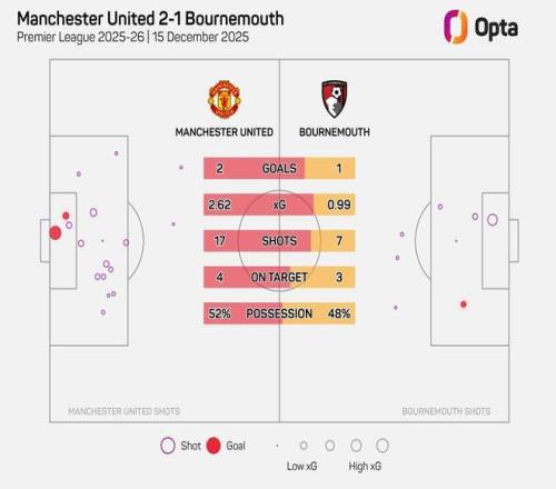 英超第16轮,曼联主场对阵伯恩茅斯,上半场战罢曼联2-1领先,上半场比赛,两队一共完成24次射门(曼联17次),在对方禁区内触球41次,均为本赛季英超上半场最多。