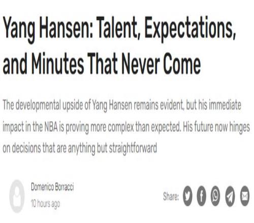 美媒:杨瀚森被现实浇了一盆冷水面临白白浪费新秀赛季风险